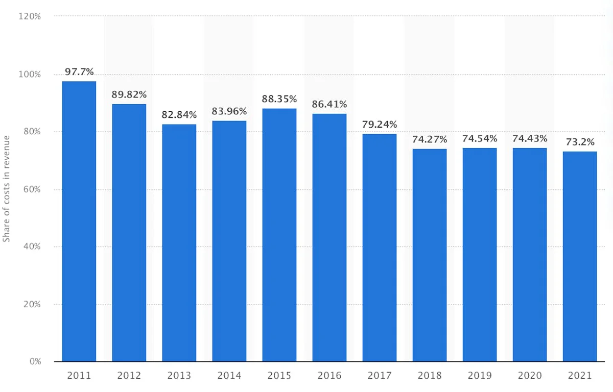 Spotify's Cost of Revenue as a Share of Total Revenue, 2011 to 2021