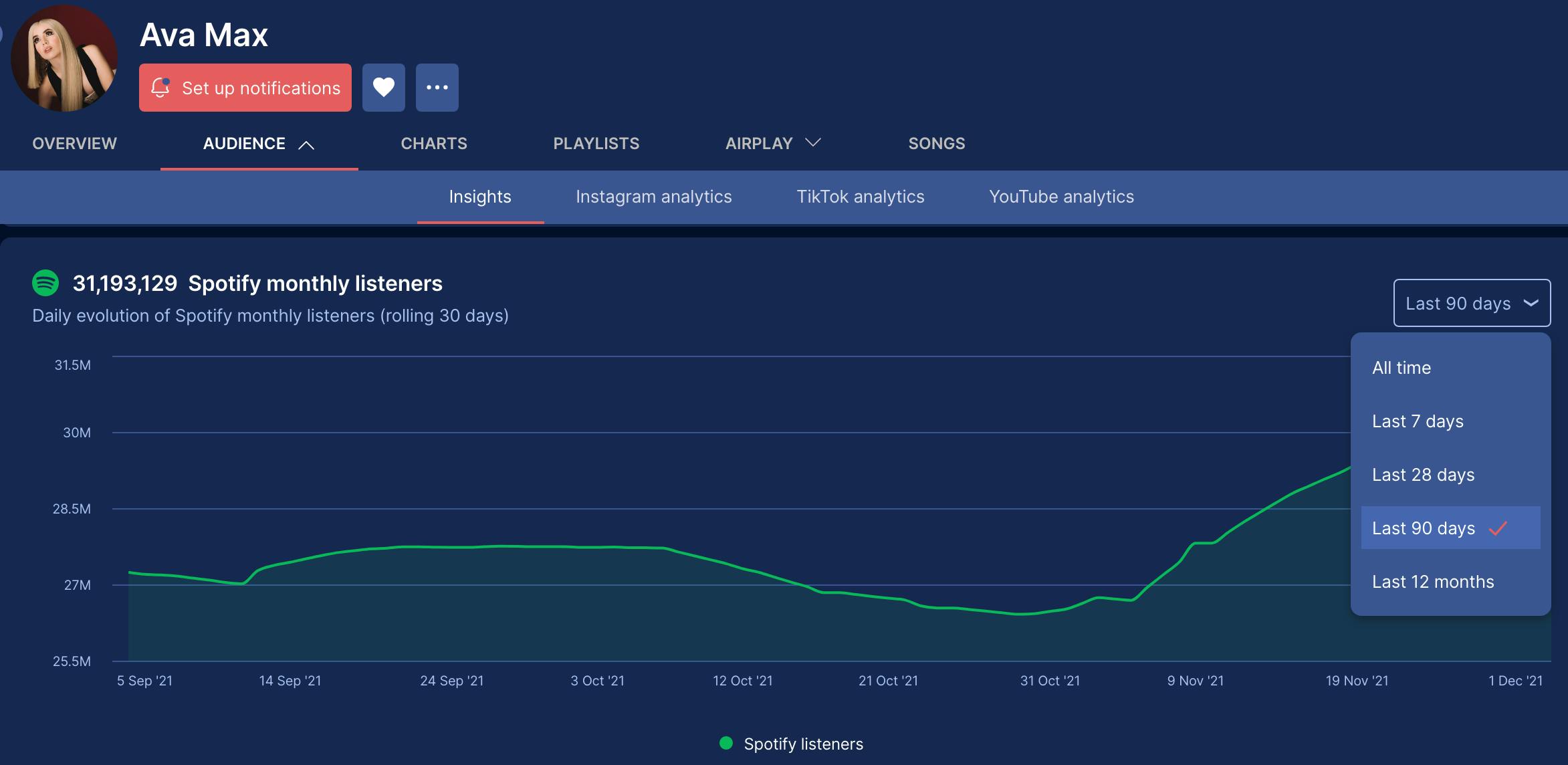 "All-time" and "90 days" period selectors are added in "Audience" and "Compare artists". You can also select these as your default period in user preferences.