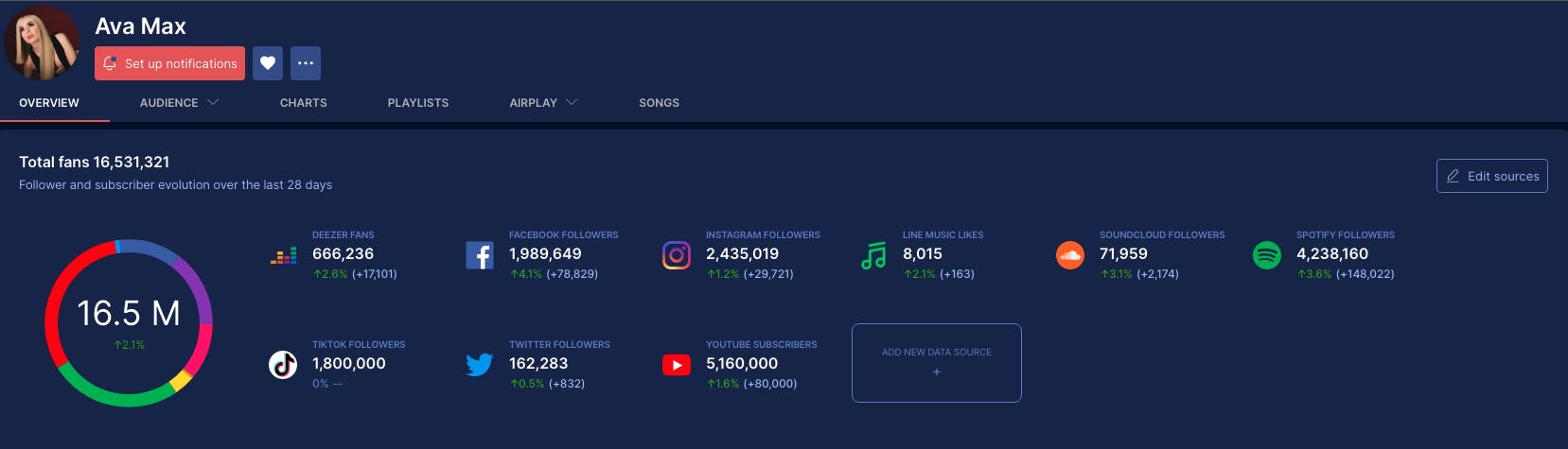 Line Music followers is now available in the artist's "overview", "audience" and "compare artist" pages! If an artist Line profile is missing, you can add it by using "edit sources".