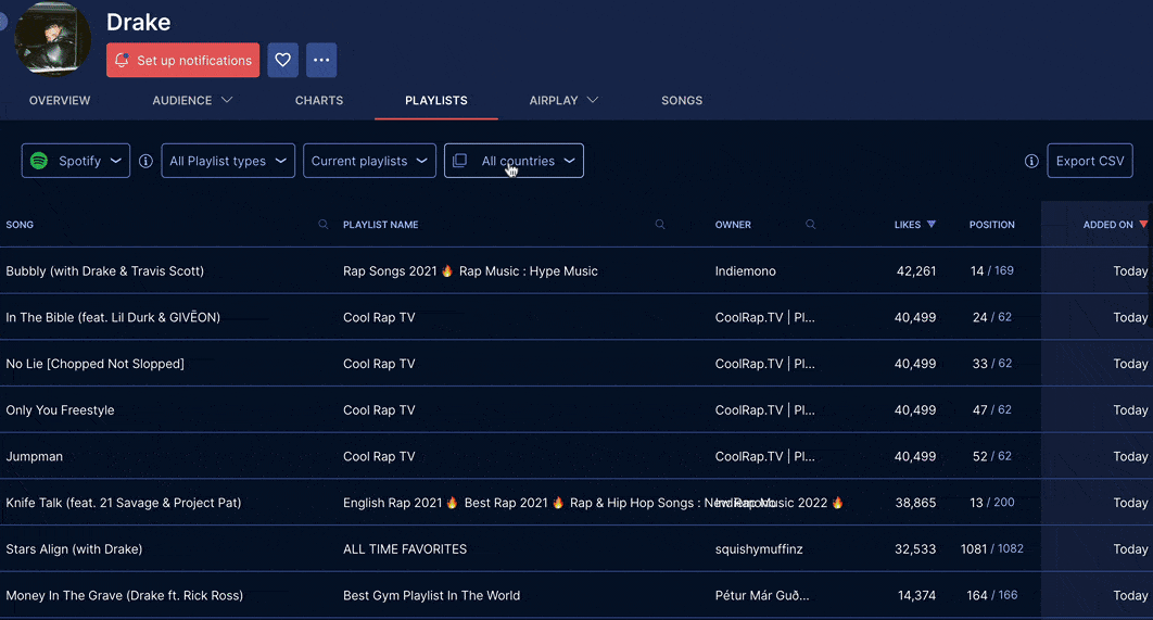 Playlists notifications can be filtered by country.