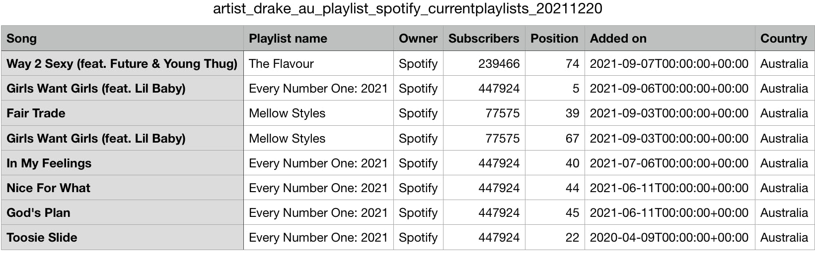 Get the tracks of more than 10 million playlists from 330k+ curators! Favorite them for easy access and export them to CSV for further analysis.