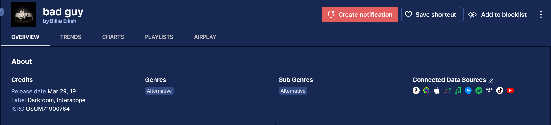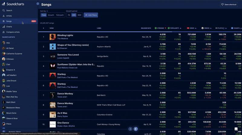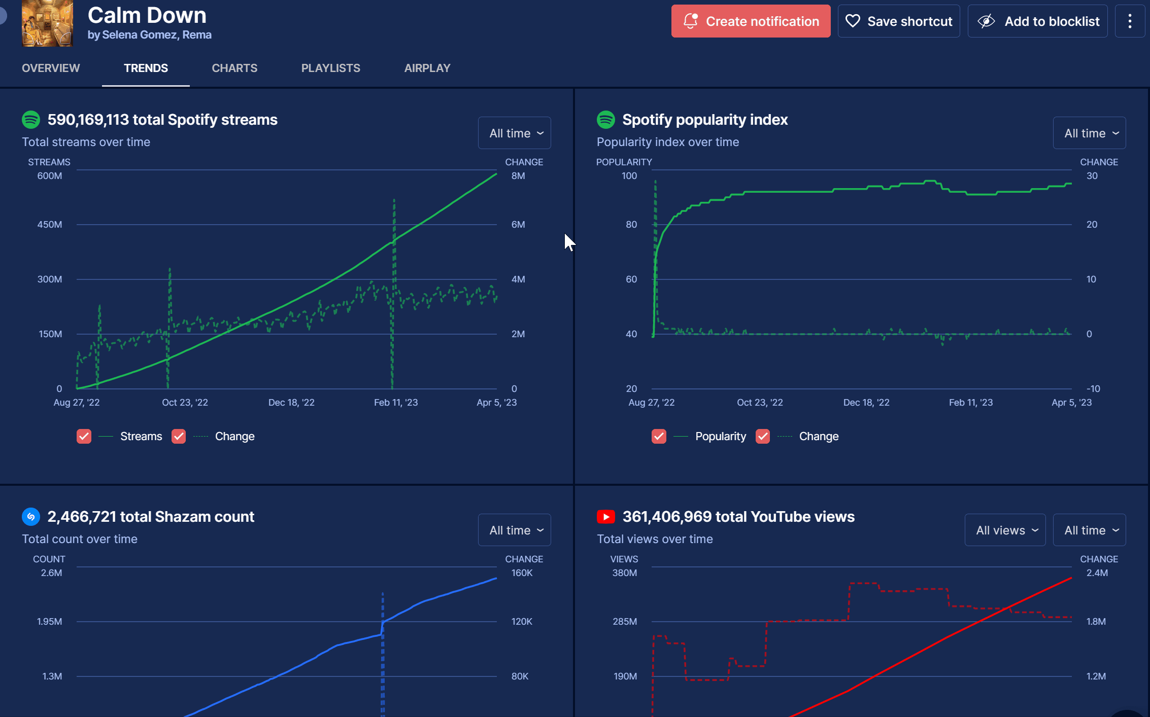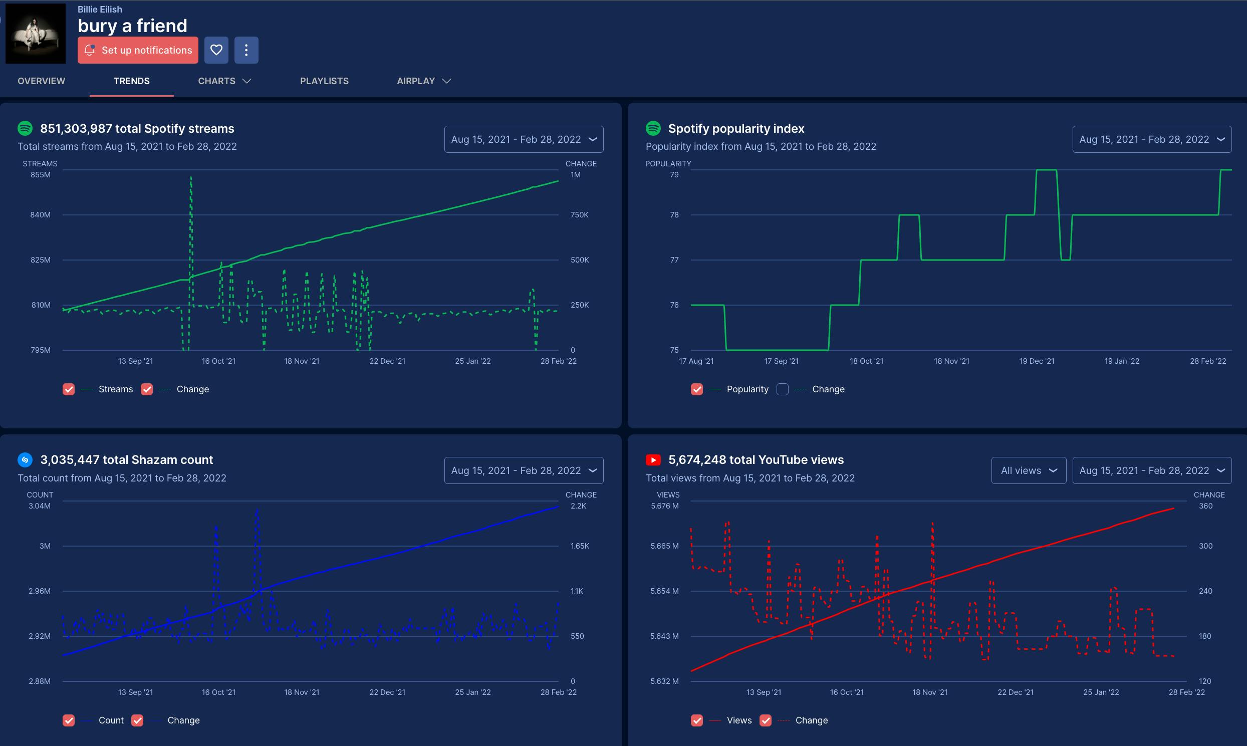 One of our most requested features is now live! Go to any song profile and discover the new "Trends" section to analyze Spotify streams, Spotify song popularity index, Shazam count, and YouTube views.