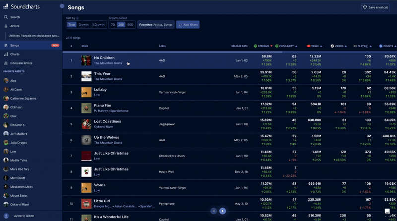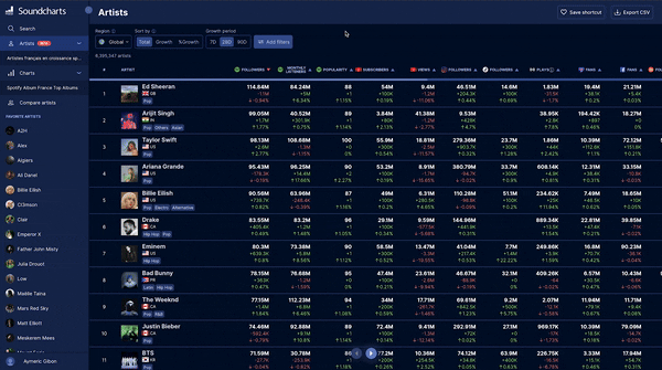 We've added a new Growth Level metric to highlight how an artist's momentum is evolving over time. The level is calculated from the Soundcharts Score over the last 13 weeks.