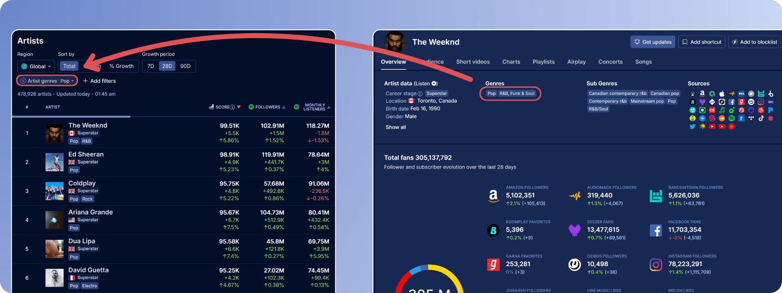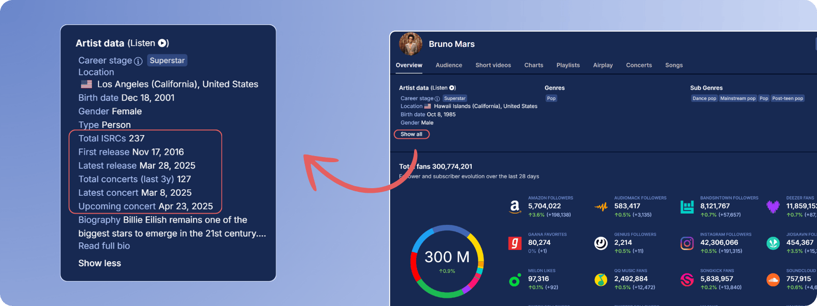 • Full lineup with artist metrics across streaming and social platforms
