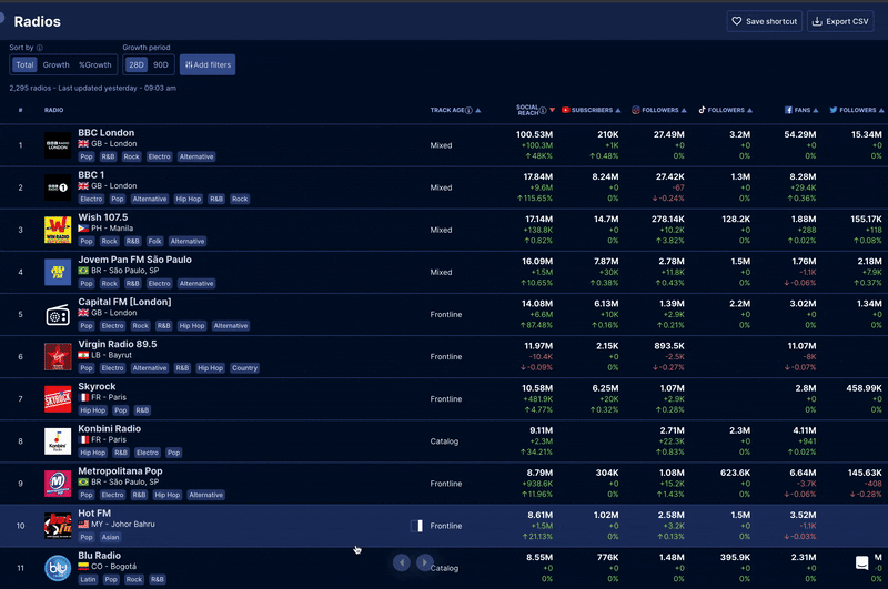 You can now filter by 'Global/main/viral', 'Genre/Mood', 'Radio Station', and 'City' to refine how charts are displayed within the dashboard - build custom views in a few clicks!