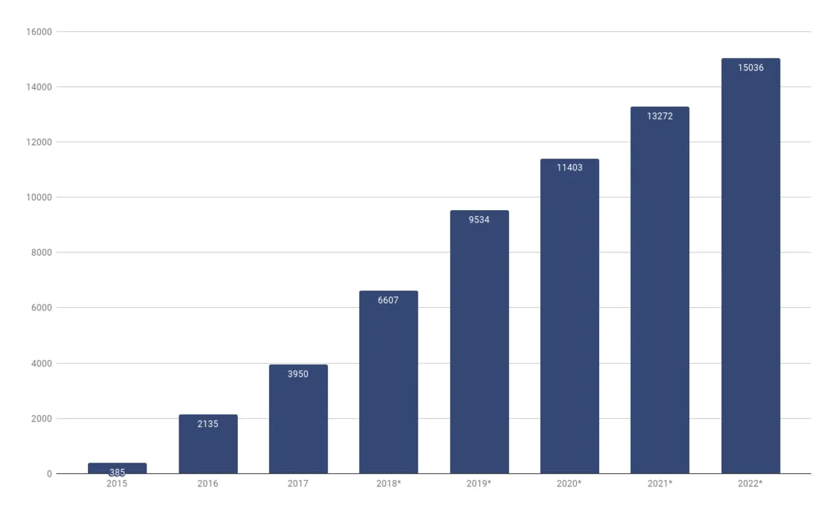 Live Streaming Revenue in China, 2015-2022, $US billion