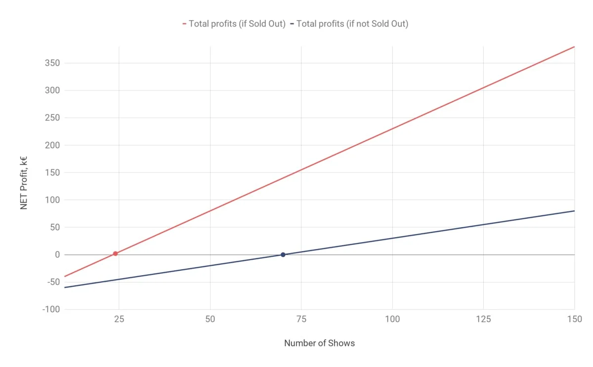 As the total costs per show go down against a constant revenue, the tour turns a profit, breaking even at the 24th and 70th show for “Sold Out” and “Not Sold Out” scenarios accordingly.