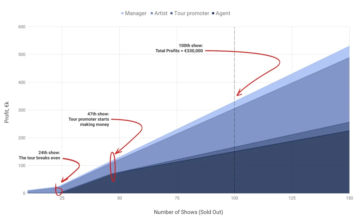 Booking agents, in their turn, earn a flat percentage on the revenues ‘on top’ (though they might put their share back in the pot if the tour doesn’t turn out a profit). That might be a lot to take in, but don't worry, we will get back to the splits and give you a clear example with a tour simulation you can find below.
